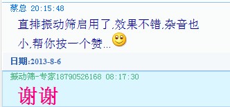 您好,得知您購(gòu)買我們的ZPS-800型直排篩現(xiàn)已投入到生產(chǎn)中,并且效果很好,雜音也很小,為此向你祝賀。我們大漢公司生產(chǎn)的一系列振動(dòng)篩,振動(dòng)振動(dòng)篩,直排篩,試驗(yàn)篩,拍擊篩,氣流篩因做工扎實(shí),質(zhì)量可靠而受到廣大客戶的稱贊。