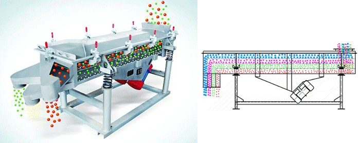 兩電機軸相對篩面在垂直方向有一傾角,在激振力和物料自重力的合力作用下,物料在篩面上被拋起跳躍或向前作直線運動,從而達到對物料進行篩選和分級的目的。適用于粒度在0.074—5mm,含水量小于7%,無粘性的各種干式粉狀或顆粒狀物料的篩分給料粒度不大于10mm。